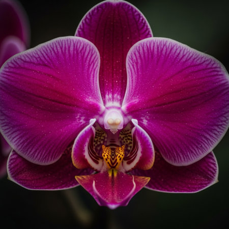 Close-up of a blooming orchid with intricate patterns and vivid colors, highlighting its exotic beauty and elegant structure.