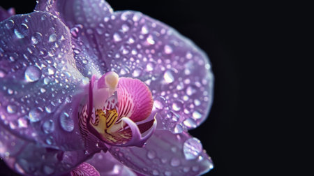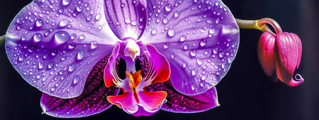 Beautiful purple orchid flower with water drops on a black background