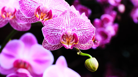 Close up Blooming beautiful Mini pink Phalaenopsis orchid in colorful flower garden with soft focus background