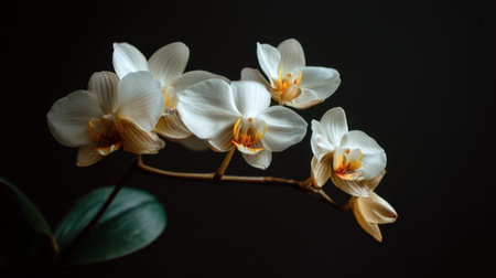 This captivating image features elegant white orchid blooms gracefully positioned against a dark background, emphasizing their delicate beauty and serene charm.