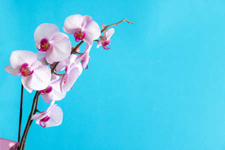 Orchids flowers against bright blue background. Minimal spring bloom, tropical or holiday layout.Copy space
