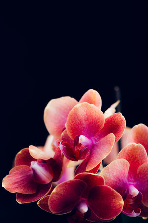 Blooming peach colored orchid flowers on a black background copy space
