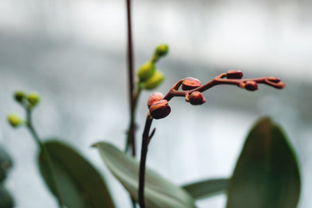 Orchid flower spike by the window under artificial light in winter, Phalaenopsis flower buds closeup