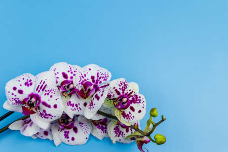Branch of orchid phalaenopsis on pastel blue background. Top view, copy space