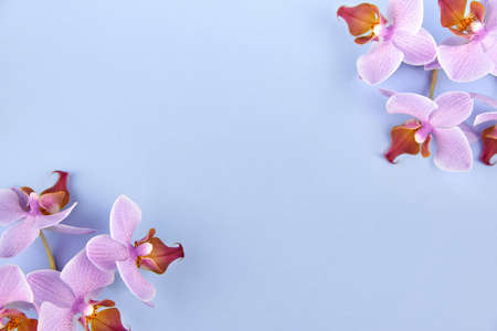 Purple orchid flowers on a blue background, copy space.