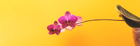 Banner with orchid in a flower pot in front of yellow background.