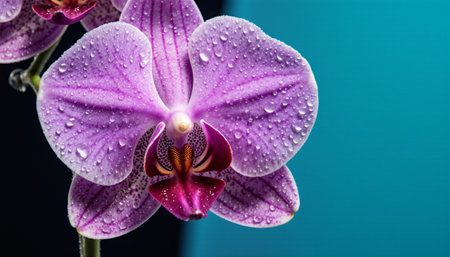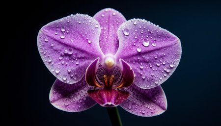 Beautiful purple orchid flower with water drops on a dark background
