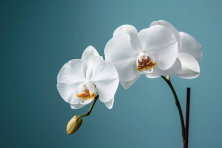 This image features elegant white orchid blooms against a soft blue background, offering a serene and peaceful aesthetic perfect for various design and decor projects.