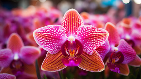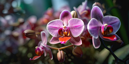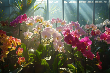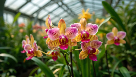 Vibrant tropical orchids in lush greenhouse setting