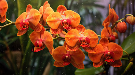 Beautiful orange orchid flowers with rain drops on the petals