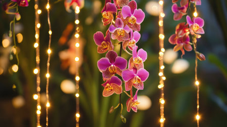 A captivating scene featuring beautiful purple orchids enhanced by shimmering lights, creating a magical garden atmosphere perfect for events.