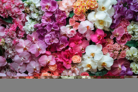 Colorful floral background with pink, purple, and white orchids and roses.