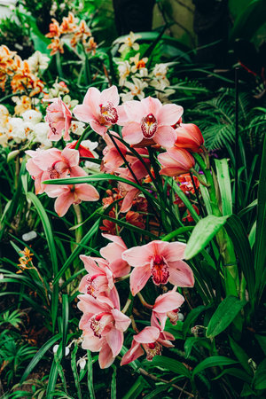 Pink Cymbidium orchid flower blooms in a botanical garden in spring