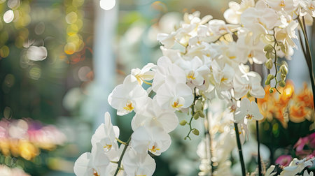 White orchids arranged elegantly in a garden with a floral backdrop