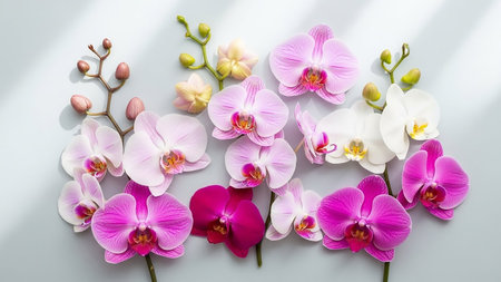 A arrangement of delicate pink, white, and magenta orchids with buds scattered on a light gray surface, casting soft shadows and showcasing their intricate petals.
