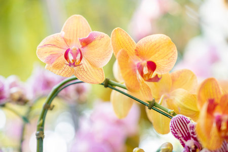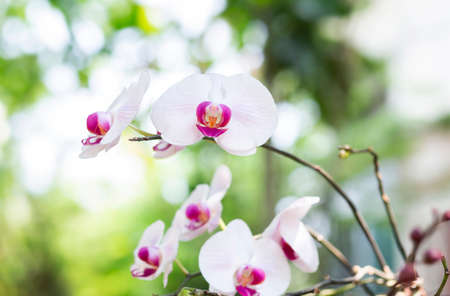 Beautiful orchid flower. Phalaenopsis. A group of beautiful orchids in the park. With soft morning sunlight, soft focus
