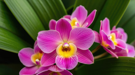 Stunning close-up of vibrant pink and yellow orchid flowers thriving amid lush green foliage, capturing the essence of tropical beauty and inviting tranquility.