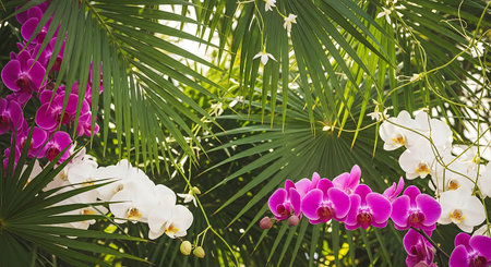 Orchids and palm leaves in the garden. Tropical background.