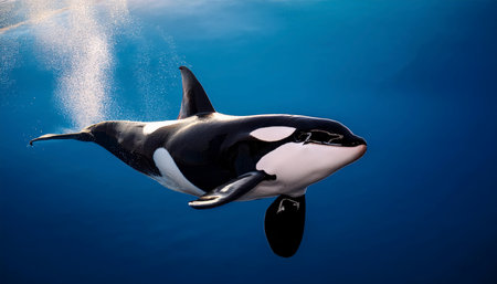 Orca swimming gracefully in the deep blue ocean with scattered light reflecting off its glossy black and white skin ideal for marine life and ocean conservation projects.
