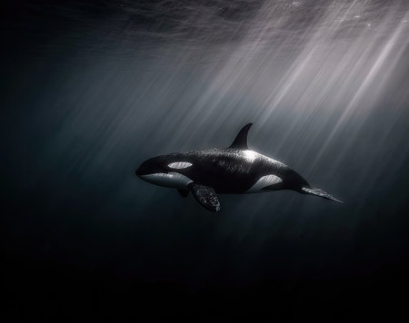 A striking image captures an orca gracefully swimming underwater. The black and white marine mammal is illuminated by beams of sunlight filtering down. The composition emphasizes the contrast between light and shadow. This could be useful for educational materials or artistic projects.