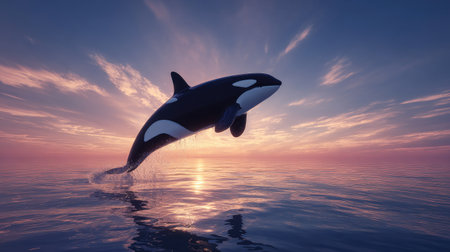 An orca whale breaks the water's surface, illuminated by the warm hues of a sunset. The image displays a smooth, realistic style with a focus on color and the whale's dynamic form. The scene suggests a marine environment at dusk, offering potential use in educational or illustrative contexts.
