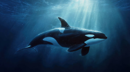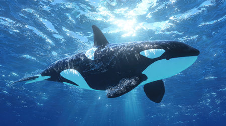 An orca, a large marine mammal, is seen swimming underwater. The image presents the creature in its natural habitat, with sunlight filtering through the water. The composition showcases the animal's black and white pattern in a detailed and realistic style, ideal for various editorial and commercial applications.