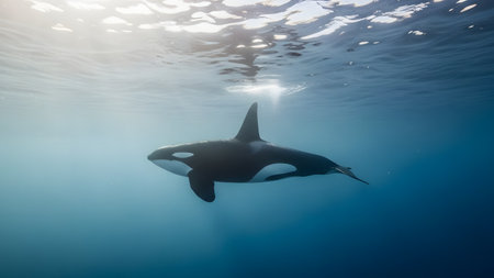 Immerse yourself in the beauty of a majestic orca gliding through crystal clear waters, surrounded by sunlit ocean depths, showcasing the wonders of marine wildlife.
