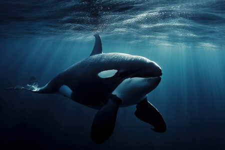 An orca, also known as a killer whale, swims gracefully underwater. The image showcases the animal's striking black and white pattern with the presence of sunlight penetrating the water's surface. It offers potential use in various editorial and commercial contexts, such as educational material or environmental campaigns.