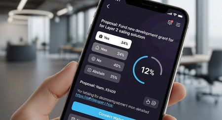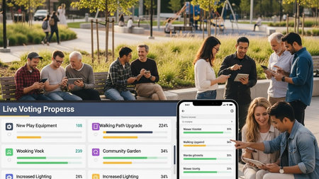 A diverse group of people actively participating in a live voting process to decide on park improvements, showcasing community engagement and digital democracy in action.