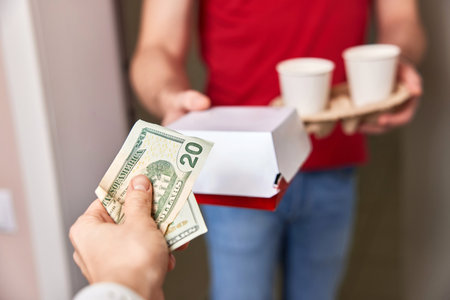 delivery man giving food box and paper coffee cups to customer and taking payment