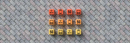 cube grid with wifi and 5G symbols on stone pavement background - 3d illustration