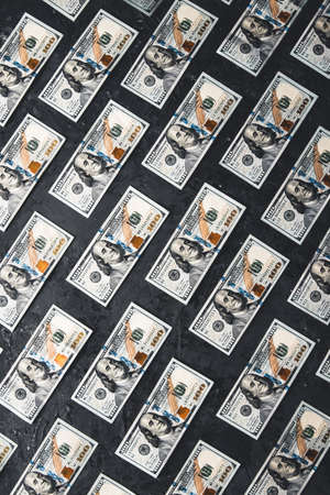 One hundred dollar bills are creatively laid out. Beautiful original cash flow. One hundred bucks as a background on a long banner in high resolution. Business concept, development perspective.
