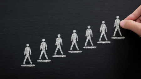 A hand is drawing a line of people on a blackboard. The people are drawn in a way that they are walking up a hill. Concept of progress and growth, as the people are moving up the hill