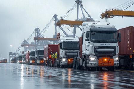 A busy shipping port scene captures trucks maneuvering through rain on a wet road, surrounded by towering cranes and colorful containers.