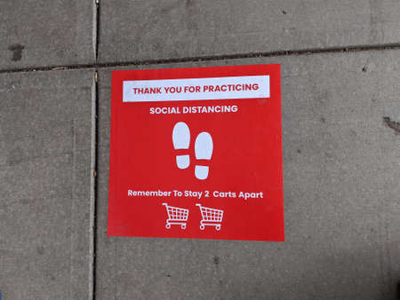 Social distancing signboard and barricade tape on sidewalk during the coronavirus quarantine