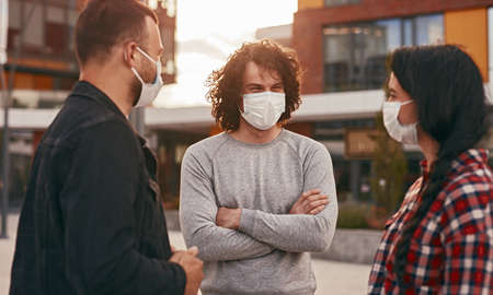 Friends in masks meeting on city street