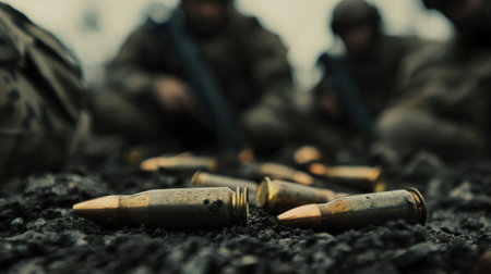 Bullets lying on ground with military background close-up. High quality photo