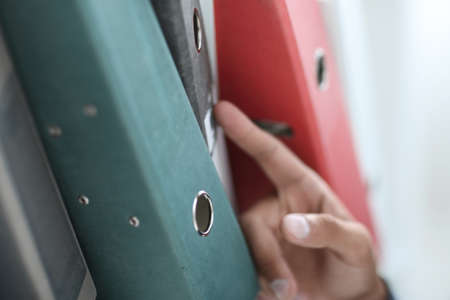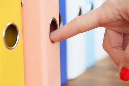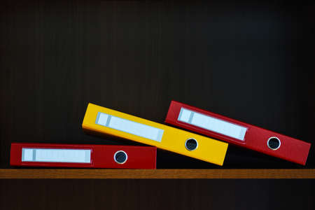 Close up on multicolored office folders on the bookshelf backgrounds.