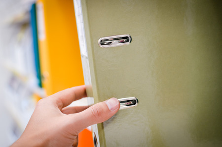 Close up on hand holding office folders on the bookshelf backgrounds.