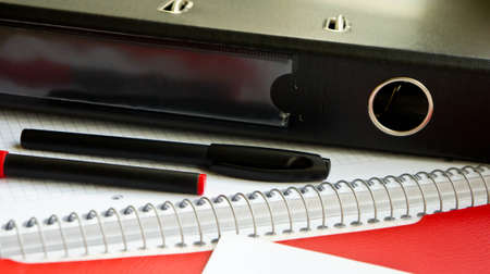 two pen on white paper, a red folder and a black folder
