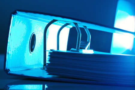 Organized and Important: Up-close View of Blue Office Folders with Neatly Stacked White Documents