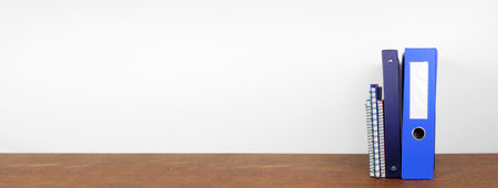 School binders and notebooks on a wood shelf against a white wall banner background. Back to school concept. Copy space.