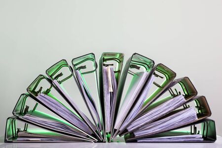 Half circle of office folders with archived paperwork in green light.
