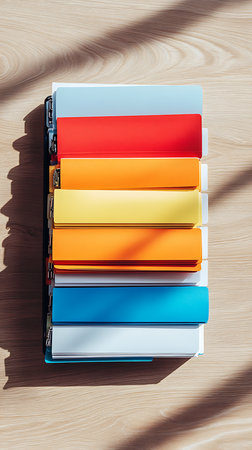 A top-down perspective showing a stack of vivid, multi-colored file folders aligned on a wooden desktop under soft office lighting, creating a neat, organized scene.
