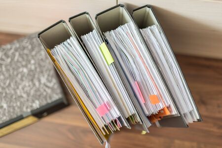 Paper work concept. Piles of colorful binders with many different documents invoice facture. Workplace office of business people.