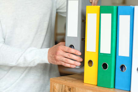 Folders for documents in the closet on the shelf in the office, files, copy space, background, close-up, office supplies