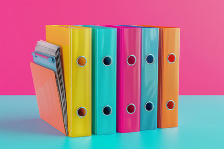 A vibrant arrangement of colorful office binders on a clean white background, perfect for conveying themes of organization, efficiency, and a professional workspace.