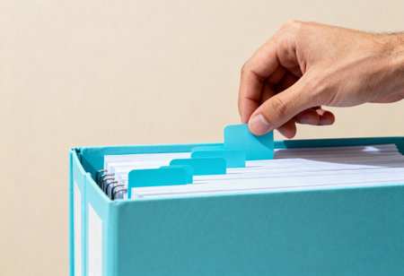 Business person organizing important documents in a large blue filing system, hand sorting through file folders in an office setting.