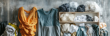 A vibrant collection of upcycled clothes and fabric scraps arranged on a shelf against a textured wall, highlighting eco-friendly design.