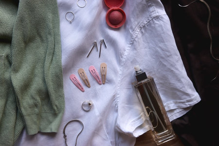 Pastel green cardigan, white shirt, gray trousers, black loafers, various silver jewelry, perfume and make-up products. Outfit concept, top view.